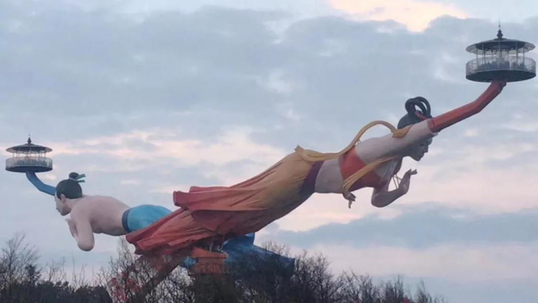 “飞天之吻”建立在望仙崖一处悬崖边上,主体总高52米,总重620吨,底座距崖底乌江的垂直落差1000余米。运转时,南边的飞行岛代表白马王子,北边的飞行岛代表仙女,一双机械臂3分钟内可上升52米,双岛在高空定格后,旋转307°交汇形成飞天之吻的景象。