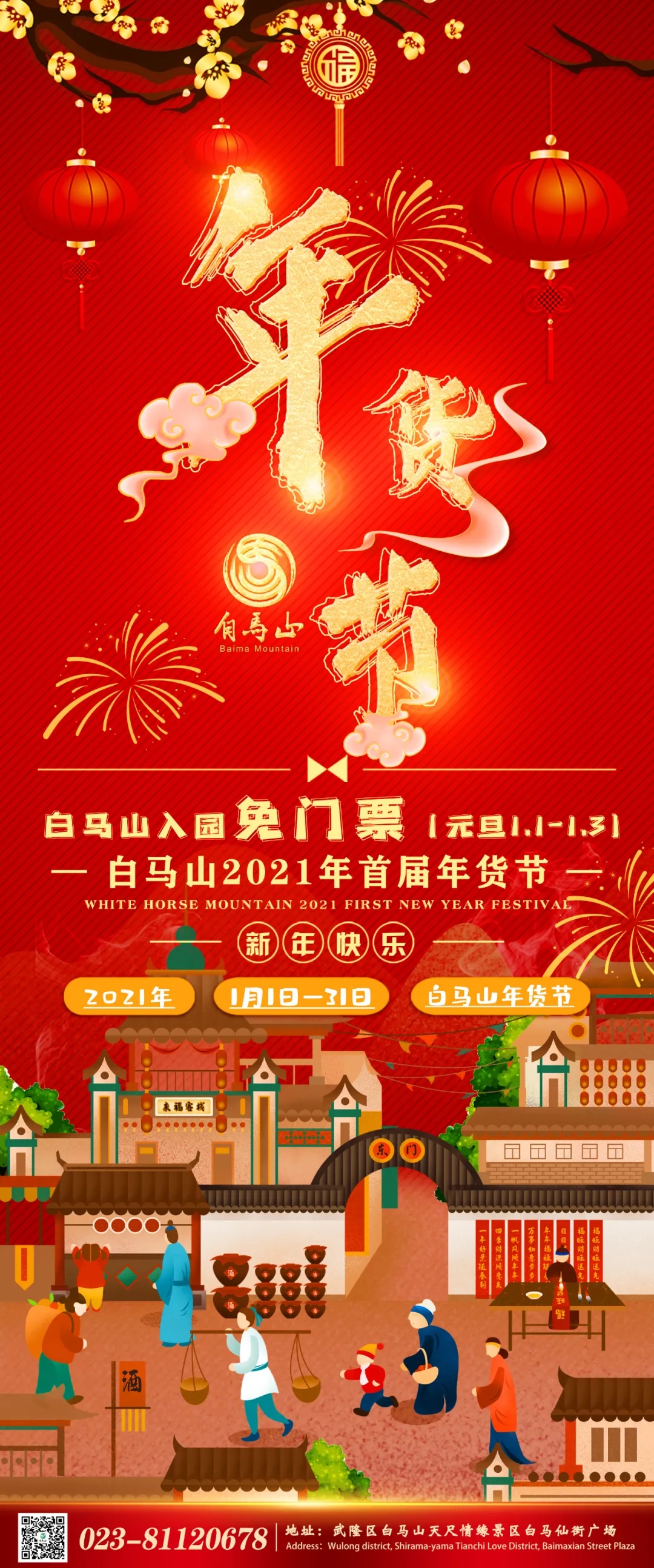 2021年1月,武隆白马山天尺情缘景区将举办首届年货节,集齐武隆特色产品、武隆本土年货,打造热闹红火的年货集市,将提供超多年货超值优惠。