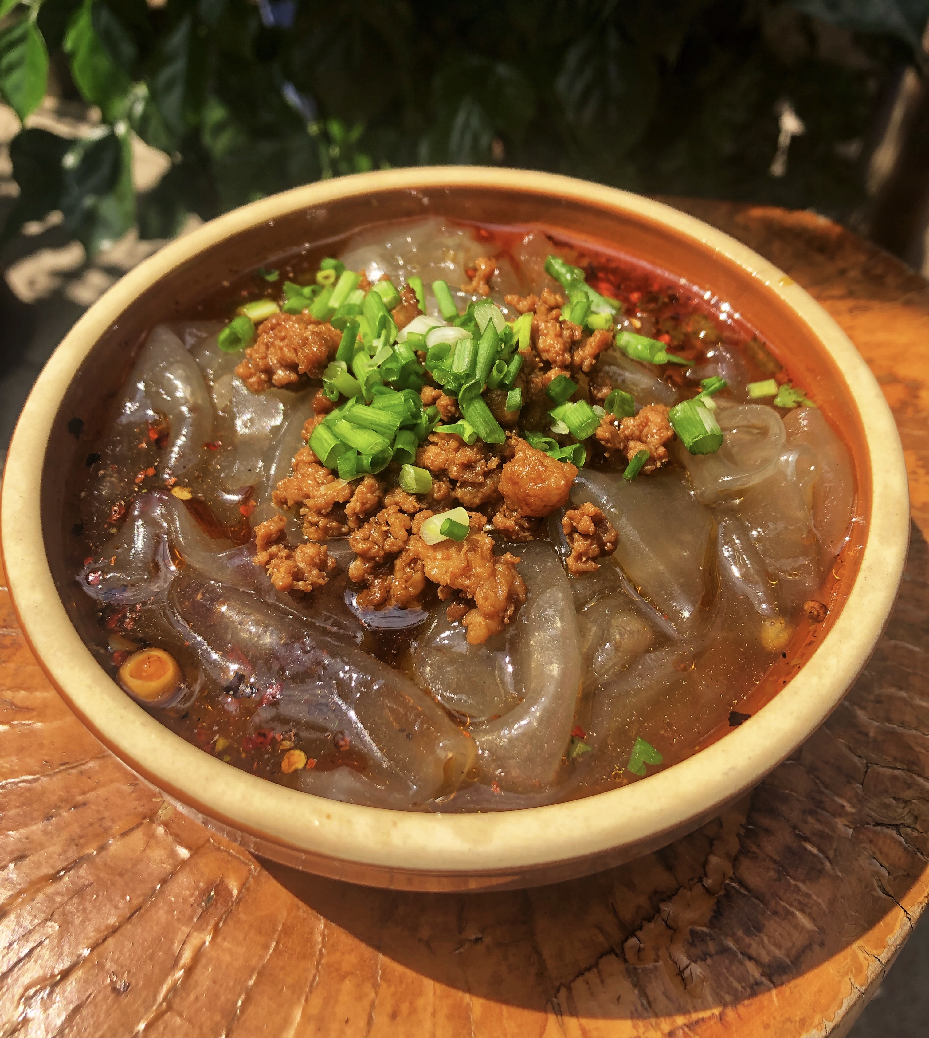 中国苕粉源出武隆。1563年,红薯(又名红苕)传入中国,因武隆特有气候、岩土、夕晒、江风、泉水,使红薯自然演变成红皮、脆甜、清香的武隆红宝石红薯。康熙年间,武隆乌江边一纤夫以此原料研制而成苕粉,以其“鲜糯筋道”闻名遐迩。在重庆,红薯也叫红苕,“苕粉” 也就是我们日常说的红薯粉。相比较寻常小吃,“苕粉” 是粗粮制品,含有大量的蛋白质、维生素与矿物质,经常食用苕粉能减少热量摄取,是减肥的最佳食品之一。