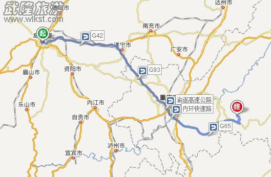 5、沿G93/成渝环线高速一直向前行驶183.2公里,从出口离开,朝南川/G65方向,进入包茂高速/渝湘高速/G65;(此路段收费139元)