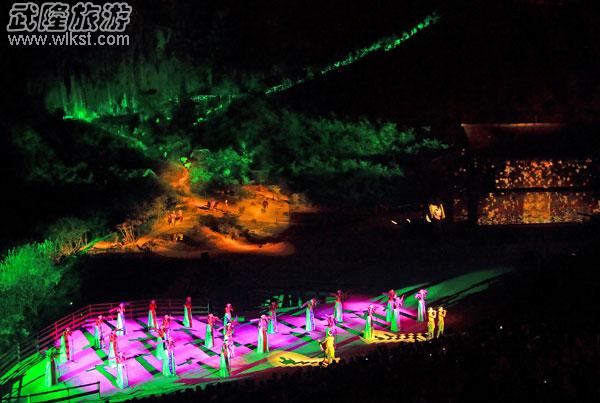 吃完晚饭后,可乘车前往印象武隆剧场观看晚上8点30分的印象武隆大型实景演出。 印象武隆由著名导演张艺谋、王潮歌、樊跃共同打造的大型实景演出,该演出充分结合武隆喀斯特世界自然遗产资源和地方特色文化,以自然山水为舞台背景,以群众生产生活、民风民俗、历史人文和美丽传说为艺术素材,带给观众以文化为线、山水为伴的视听享受和心灵体验。