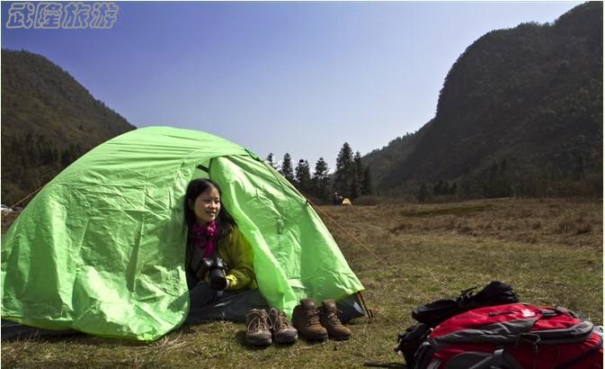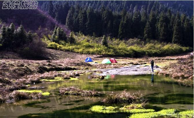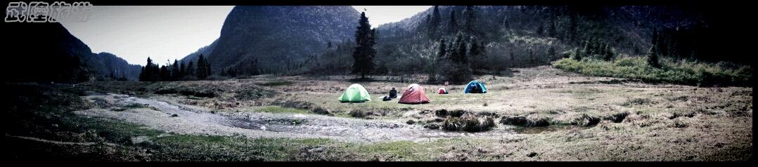 从远处看我们的露营地,山谷间三顶鲜艳的帐蓬,潺潺的溪水在帐蓬前面汇成了一汪彩色的水潭,水草漫出水面,很有些梦幻的感觉。