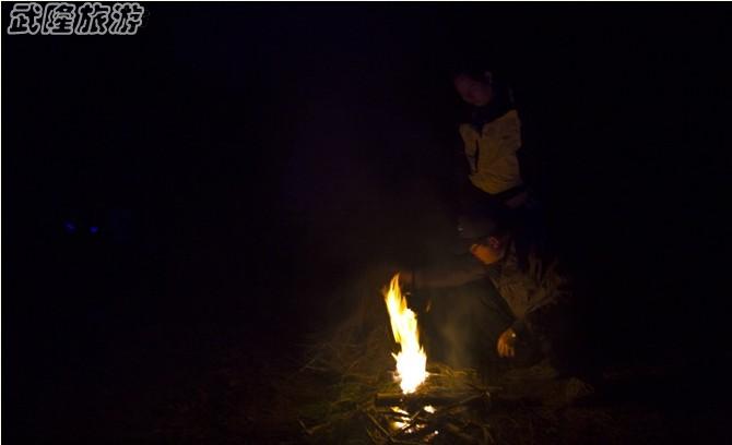 休息一会儿,去农家乐吃饭,出来天就黑了。这个时候,大家都感觉到了寒冷,没想到温度下降得这么快,下午大概有二十多度吧,这个时候可能就只有几度了。速速回到营地,怕冷的就钻进了帐蓬,只听到说话,看不见露脸了,坚决不出来了。而男士们,开始幻象生一堆火。在电视上看过很多荒野求生的节目,那里面不论是冰天雪地,还是潮湿的森林,生火好象是一件挺容易的事情,可是经过我们实践,这其实是太困难的一件事啊。找来的灌木枝可以引燃,但燃得很快,柏树枝又有些潮,一时半会又烧不起来。男士们一会儿去找树枝,一会吹火,忙得不亦乐乎。火堆最后在忙碌中只燃烧了十多分钟,最后宣告失败了!不过这也算一段好玩的经历吧。