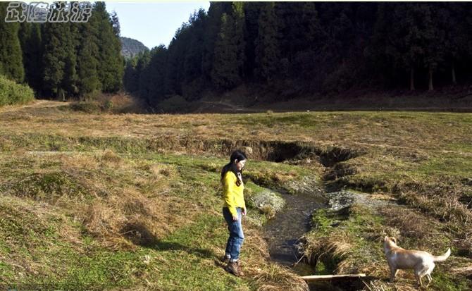在小溪的最窄处,和它狭路相逢,这是条聪明的狗狗,知道找最窄的地方跳过来。