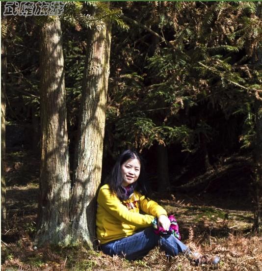 在松柏下的留影。地上铺满了落叶,很松软的感觉。