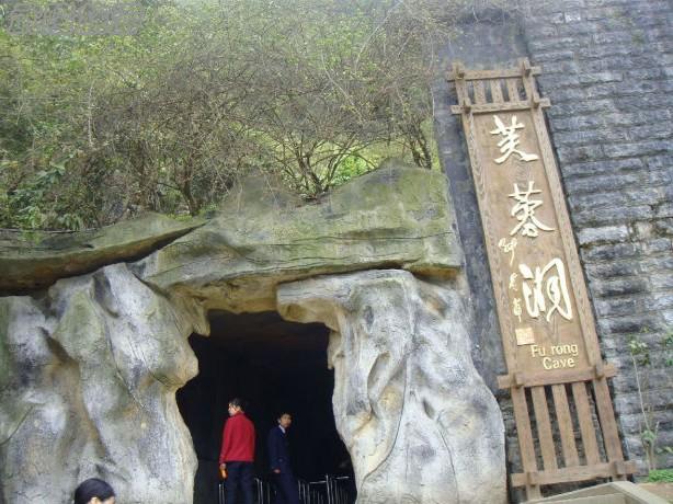 经过3个多小时的车程,途中我们穿过了长达7200米的白云隧道,在9点40分左右到达了武隆县的江口镇,进入了芙蓉洞。洞外艳阳高照,炎炎烈日晒得人不敢多往光亮的地方张望,都躲在树荫下;洞内光线昏暗那不必说,最让人感觉惬意的是那凉爽的舒适温度。我们进入了大自然安装了“空调”的一个大大的洞穴。和去年我们去过的阳朔的聚龙潭相比,芙蓉洞要大得多。但没有那么多人工布置的五光十色、光怪陆离的成分,大都以本来的面目展现在游客的眼前。也没有聚龙潭里给溶洞里各种奇形怪状的溶岩命名的多,也少了导游的讲解。因此虽然面对如此神奇、美丽的溶岩景观,没了人为的指引,想象起来是有点吃力的了,但也无不给人以更加开阔的想象空间。手扶着洞内两侧不锈钢栏杆行走在石阶上,看着洞内精致奇形怪状的钟乳石,大人小孩无不啧啧称赞:有的小巧玲珑精致,如一朵朵盛开的花朵,一朵朵可爱的蘑菇,一只只活泼的小动物;有的气势恢宏,一大片钟乳石齐刷刷向下,如万箭齐下,一排排溶岩依避而挂,如瀑布飞泻。一个如佛像的大石钟乳笔直地挺立在我们面前,而头衬着一个人工设置的灯光,好似佛光闪耀,引来游客频频拍照。在洞内一个多小时我们流连忘返,穿过了一段人工开凿的时光隧道后依依不舍地来到了出洞口。