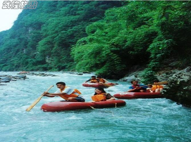 中午在江口镇的芙蓉江大酒楼用餐,安排好了住宿。下午2点30分我们一行人又乘车往黄柏渡进发,到那去漂流。沿途俯视着黄柏渡里漂流的人,我们大都觉得那溪流的水太少,太阳光又是那么强,这次漂流可能不是那么好玩。没想到我们竟然在这里漂流了3个多小时,也没被太阳照射。都说男女搭配干活不累,我们这行人就按一男一女一个皮筏子分定而坐,带小孩的就三人一组。一坐上皮筏子,双手拍击着并不温热的溪水我们立即兴奋起来。皮筏子之间一开始就进行了大水战,大人小孩都欢笑着相互泼起水来。不一会儿一个个就浑身湿透了。整个漂流过程中我们刚开始打水战;然后在沿途买烤鱼、玉米吃;会游泳的就在水深处离开筏子在水里游上一会儿。溪水深浅不一,宽窄不同,溪流时缓时急,使得漂流行进起来曲折艰难。漂流下来,很多人都叫屁股疼。嘿嘿,在水浅处人的屁股会被溪流底大大小小的石头磕的。如果溪流的水再多一点,我想漂流起来会更刺激些。漂流结束,人们浑身湿透。如果这时没准备好换的衣服也不要紧,岸上有好多卖泳装和内衣裤的。