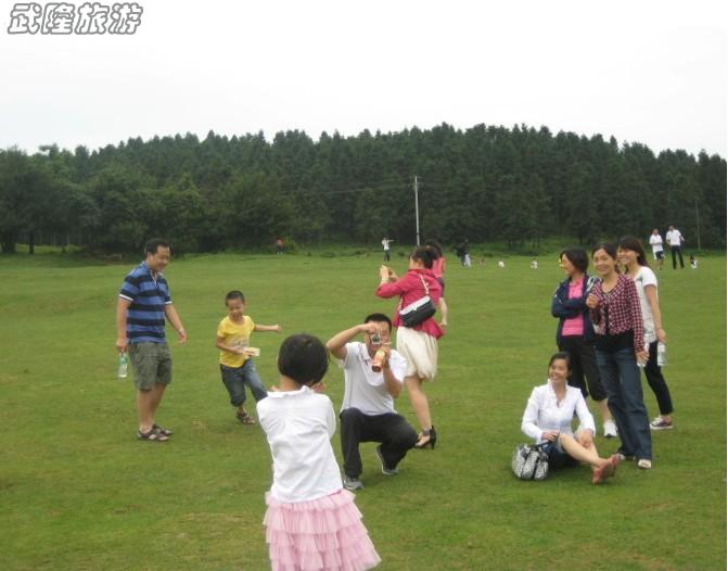 这天的天气较昨天温度降了很多,没有艳阳高照的景象,这使得我们这天的旅行没吃老天爷的苦头。汽车行进在盘山公路上,左边依山,右边是我不敢多看的山崖。随着山势的渐渐增高,这时能望见比自己所在的更低的周围的群山,有犹如神仙在群山漂浮的感觉。听导演介绍,传说以前有个孝顺的媳妇为身患重病的婆婆采药累得昏倒在山中,被一个神仙姐姐用奇药救活,仙女山因此而得名。大概9点左右我们到达了仙女山售票点。然后坐上形状是火车的汽车,只几分钟就来到了仙女山山顶——一个美丽的大草原。虽然这个大草原没有我想象中辽阔,但还是被她绿油油的草地,草原中零落的特有的树木,以及周围像圣诞树那样的杉树所吸引。人们融身这美丽的草原投入她温柔的怀抱,舒展开张张笑脸,或竞相拍照留念,或悠闲散步,或嬉戏打闹。草原上黄色、黑色的马儿丝毫没有被游客们打扰到,悠闲地吃着草,或驻足张望。在导游的呼唤声中,我们一拨人慢慢集中依依不舍地离开了这迷人的大草原。