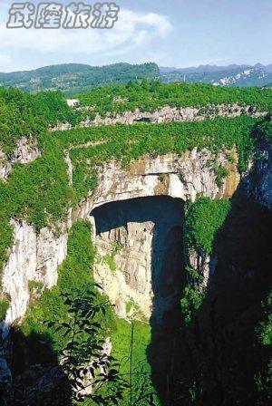 天龙桥下另有天生坑,坑内又生洞,且洞洞相连恍如克里特岛上的米诺斯迷宫,令人倍感神奇;青龙桥位居第二,是三桥之中垂直落差最大的一座。桥高350米,跨度400米。桥身青翠,藤蔓缠绕。待到日落西山,余晖尽洒,青龙桥下凉风习习,桥身也因日光的关系而变成了暗绿色,远观正似一条青龙欲飞冲天;