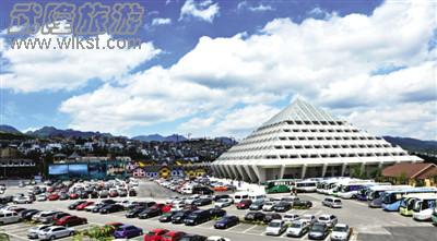原来我们正行在天龙桥的桥面上,乘电梯来到桥下,电梯上只有"1、2",落差却有百米。