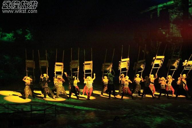 《印象·武隆》 以群众生产生活、民风民俗、历史人文和美丽传说为艺术素材,尤其是以川江号子的消失为主线唤起人们对文化的传承。 这是“抬滑竿号子”。另外还有“打夯号子”,“抬石号子”等。