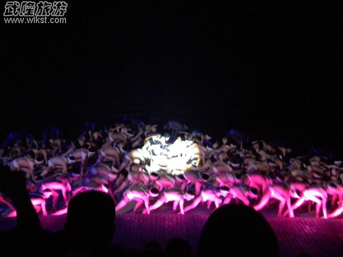 走过隧洞,来到一片开阔地,这便是专门为《印象·武隆》设计的露天剧场,据说烧了2个亿。此地名为“桃园大峡谷”,三面环山,一面临谷。座位依山而设,全部通电,不能挪移,椅背后面那亮着的部分显示着座位号,椅子下面备有雨衣。中间一个小小的平台作为演出场地,而这个平台的下面就是深谷。于我来说,不要说在上面跳舞,如临深渊的感觉,想想都十分可怕。