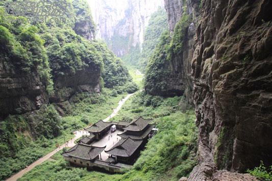 来到天生三桥,你不得不佩服,大自然的鬼斧神工,由于地质作用,形成的天坑,其险峻的气势,足以让你感到震撼。乘电梯80米下半腰,穿天龙桥洞下400米到谷底四合院式的古官驿.从天龙桥的桥洞往外看,就是青龙天坑。仰观,拱孔高旷,壁立千仞。沿小道,观舍身崖、望石峰、龙泉洞,两旁灌木丛生,小溪流淌,绿茵塘右方有小瀑布。前方青龙桥高281米,为三桥中最高,桥洞形态随步移而改变,很美。这里的水,也因地势的作用,而形成潺潺的山涧小溪,磅礴的瀑布,神奇的喷雾,自然和谐相处的各种生灵。在惊叹这些的同时,我们也折服于创造这些的人类。