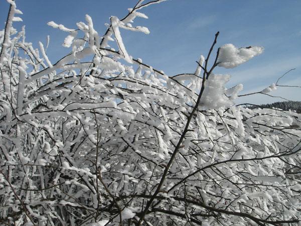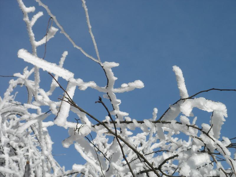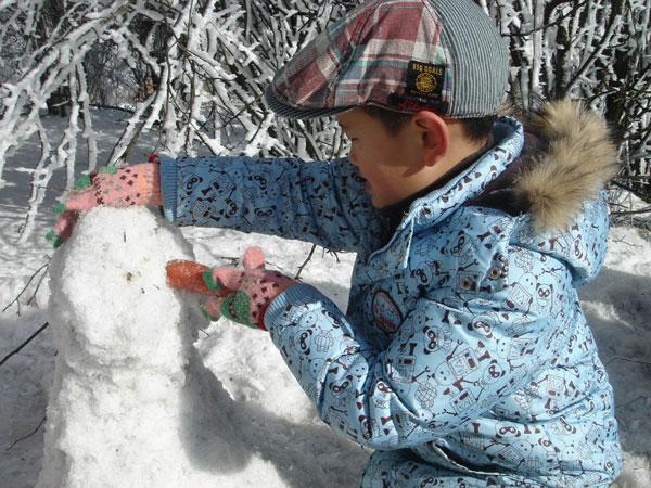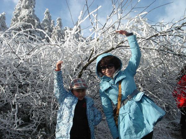 山顶的景致最终没有让我们失望,到处都是白茫茫的一片。蓝幽幽的天映衬着白皑皑的雪,搭上被冻得黑漆漆的枝,颜色纯得浸人心脾——叫你再没有任何一种语言来形容,只能傻到拿起相机“卡嚓、卡嚓”地狂拍!根本不需要取景,根本不需要对焦——因为根本就处处是景!树枝上的雪还被冻成了冰棱子,在阳光下闪着光、发着亮,让人情不自禁地想要拥它入怀——可这又哪是凡人能做到的事?这冰雪本就不是俗物,你伸出手,一会儿它便不见了踪影!孩子们在冰天雪地里玩得乐不思蜀,哪怕不停地被摔得四脚朝天,换来的也是嘻嘻哈哈的阵阵笑声!只是夜晚零下八九度的寒冷让人冻彻了心肺!不小心撒到地上的水五分钟之内就冻成冰渣,水龙头也放不出水来——水管都冻住了!还好床上有电热毯——所以早早就蜷缩到床上——就象一只小哈巴狗!