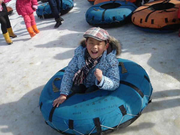 (雪上飞碟玩乐了宝贝,累坏了大人)