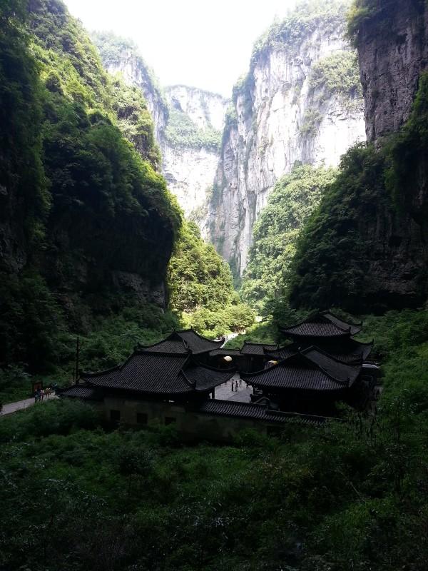 进入景区后,走过一段小道,就来到了乘坐电梯的地方。据说,这里原来是缆绳,为了申报世界自然遗产,才安装了这部高约80米的电梯。我们一行乘着电梯,迅速下到了坑底,印入眼中的是一桥飞架两山的奇观,这就是天生三桥第一桥:天龙桥。顺着天龙桥中间的小道继续下行,是一座古代驿站的建筑,据说《满地尽带黄金甲》就是在此地拍摄了一段。屋顶的青苔,半掩的木门,把我们再次带回那古道西风瘦马的岁月,多了一份沧桑。回来后,我特意将《满城尽带黄金甲》看了一遍,因为拍摄了《满城尽带黄金甲》,武隆天坑名气大增,游人大增,据景区工作人员说,在长假期间每天接待游客近5000人。也由于拍摄《满城尽带黄金甲》, 那四合院又妨碍了武隆申遗,没有办法,武隆县想出了妙招,为它装上青苔,洒上野草,俨然一个古建筑物,陈旧的样子,让人以为是不知什么时代之物,就使它与天坑和谐了。穿过天龙桥,沿着蛇行小道继续向前,很快便到达第二桥青龙桥,比之天龙的气魄雄伟,青龙桥更多了一份秀美之气。一条淡淡的小溪顺着小道从青龙桥下流过,似乎是赋予了青龙桥真正桥的意义。再径直往前是神鹰桥,此桥并非天生三桥之一,只是三桥之间的一个小插曲,虽无三桥之壮魄,却也有一番别样的滋味。起初我想不透其名的由来,不觉得桥与神鹰有何联系,但到穿越桥洞后回望,只见全桥如大鹏展翅,几欲冲上云霄,方感自然的巧夺天工,荡气回肠。天龙桥、青龙桥和黑龙桥,三座桥高、宽、跨度分别在150米、200米、300米以上,是目前发现的世界最大的天生桥群。三座天生桥的由来还有一个古老的传说,很久以前有三条伤天害理的天龙、青龙、黑龙在此兴风作浪,无恶不作,后被八仙之一的张果老惩治,责令他们在此卧地成桥,也就成了现在的三座天然石拱桥。