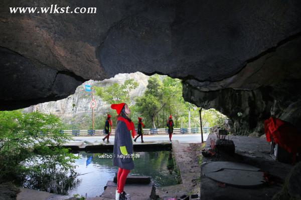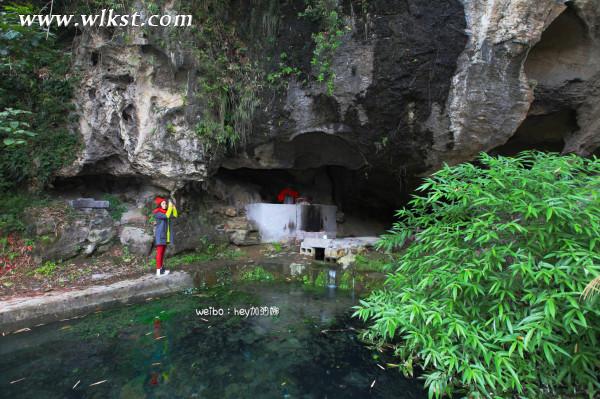 汽车沿乌江行驶,刚出县城不久,公路旁竟出现一个石穴。靠边停车,拾级而上。石穴外有一个巨大水池,池水清澈见底,四周翠竹环绕,倒影在池内。