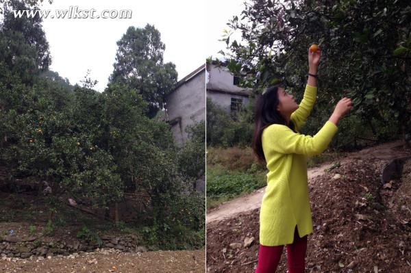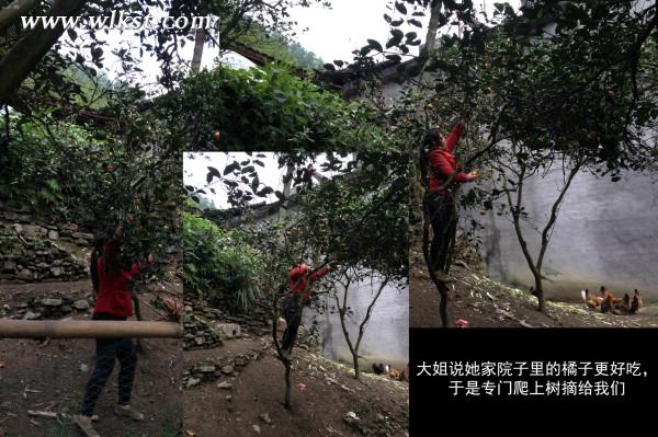 见我和小兰不会选橘子,热情的大姐爬上自家院里的橘树,帮我们摘。