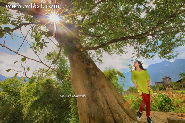 阳光从树缝穿过,形成一道耀眼的光斑。叠嶂的远山,古朴的民居,翠绿的竹林在那一刻完美融合。