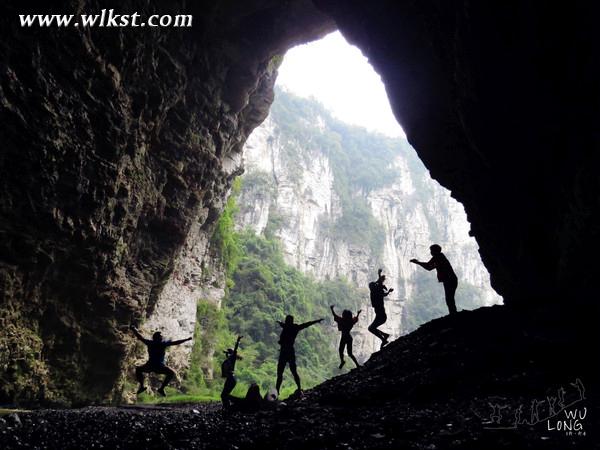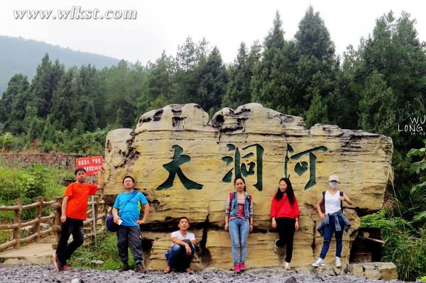 大洞河口合影 | 这张合影是出来的时候拍的。那个时候大家都已经比较累了,所以基本上身体都是靠着那块大石头的。这张图的背后就是一个停车的坝子,右侧就是过来的大洞桥(X254,10KM附近)