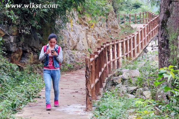 从大石头背后就是现在新建的水泥路面一直通往大洞河底下。这一段路是平缓的,一直到过了一个亭子后,转弯过去就陡坡下山(不过也全是水泥硬化好了的路面,部分由于山体太硬也因地制宜,坡陡还是提醒大家注意安全。)
