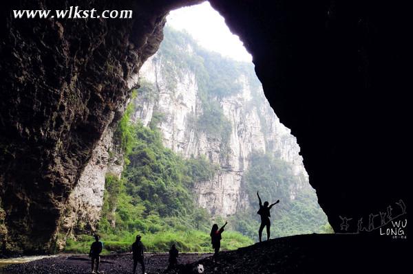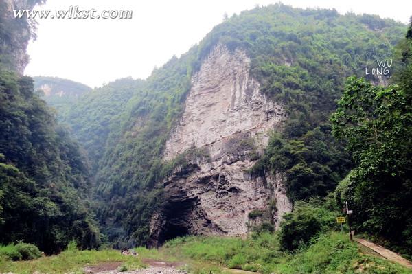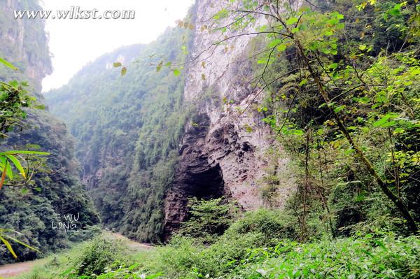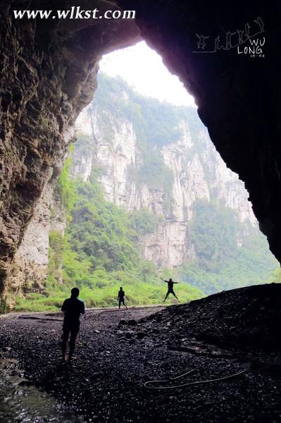 还没到底远远的就看见那个洞,对那就是大洞河的洞口。洞口是暗河的入口,左右两边的河水在洞前汇合,流进洞内,然后消失在山里。这里虽然看着很近,但是因为左侧河里用来发电的流水冲出来很大,绕行过小电站在出来的。最后到洞内拍照,也是两次涉水过去的.