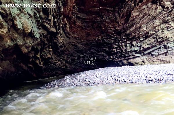 两次涉水之后,到了洞内。这里是两处水流汇合,水流特别的大。不敢贸然再往里到那个石子堆去。最后水流消失在远处的,成为了暗河。也是这里的最大特色。