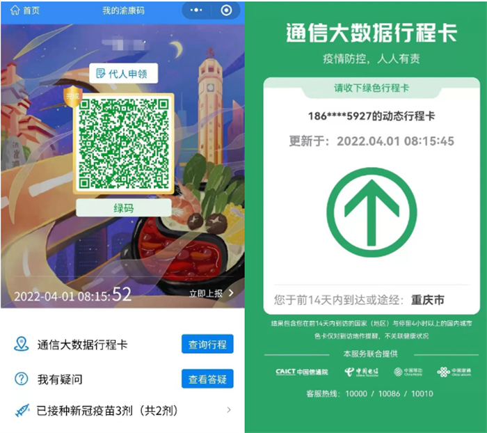 3、渝康码:微信小程序——重庆健康出行一码通——我的渝康码——显示绿码即可