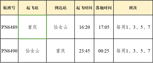 据了解,该航线由南方航空执飞,机型为空客A320。每周计划执行3班,班期为周二、周四、周六,航班号为CZ8571和CZ8572。航班CZ8571于 8:30从北京大兴国际机场起飞,11:40抵达重庆武隆仙女山机场;航班CZ8572于12:35从重庆武隆仙女山机场起飞,15:00抵达北京大兴国际机场。