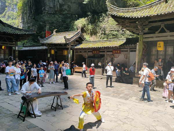五一期间,武隆各大景区精彩活动不间断,其中,天生三桥景区准备了武侠风黑衣人打卡、古筝弹奏、现场舞剑等表演;仙女山景区准备了《印象武隆》、背篼舞等快闪演出节目,每天3至5场;万峰呐溪原乡准备了盲人敲锣、丢沙包、转陀螺、踢毽子等童年趣味游戏,参与者通过大转盘均有机会赢取景区门票、红包等奖品。