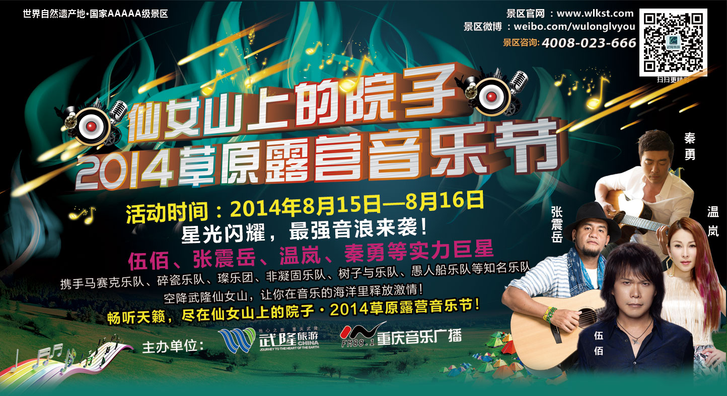 8月15、16日,“仙女山上的院子 2014草原露营音乐节”将震撼来袭,伍佰、张震岳、温岚、黑豹主唱秦勇四位两岸实力巨星和来自重庆、成都的6支顶尖乐团(碎瓷乐队、璨乐团、非凝固乐队、马赛克乐队、树子与乐队、愚人船乐队)将空降仙女山,星光闪耀,放歌草原,在音乐的海洋里释放激情。