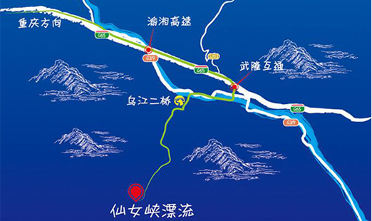 重庆南环立交上渝湘高速(G65),至武隆互通下道,经白杨路-芙蓉中路-芙蓉西路,过乌江二桥左转前方沿长峡路3公里,全程约2小时;