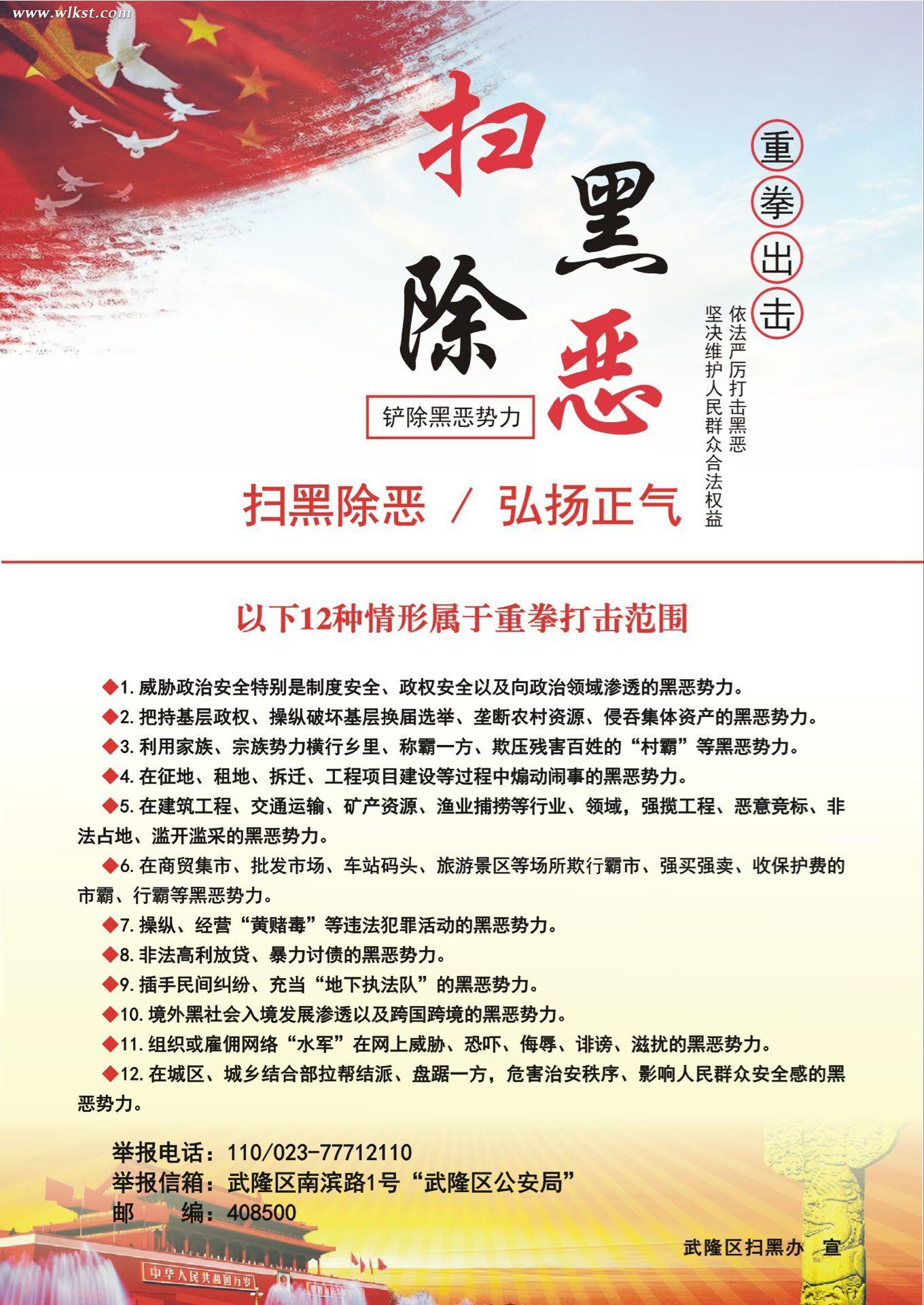 武隆区扫黑除恶举报方式:举报信箱:重庆市武隆区巷口镇南滨路1号“武隆区公安局”(邮编408800);举报电话:023-110;023-77712110;023-77824586;