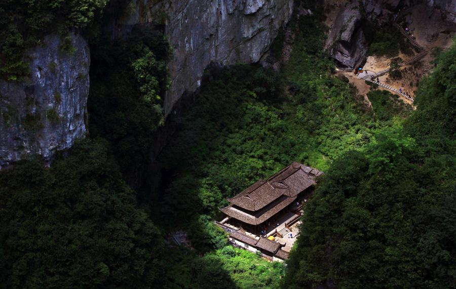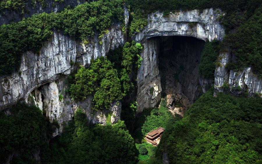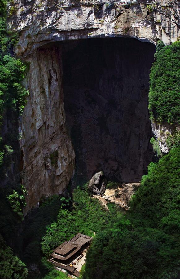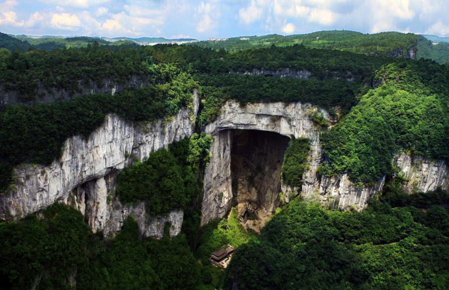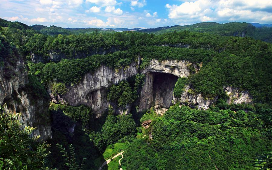 俯瞰天生三桥是非常壮观的,其山势之雄伟,峭壁之险峻,石桥之逶迤,喀斯特地貌参差裸露的灰白色碳酸盐岩石,当地特有的茂盛的针叶阔叶混交林,葱茏的绿与沧桑的白犹如一幅巨型的青绿山水长卷,意趣隽永,耐人寻味。