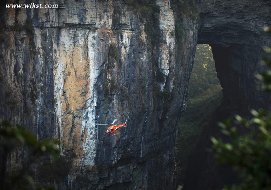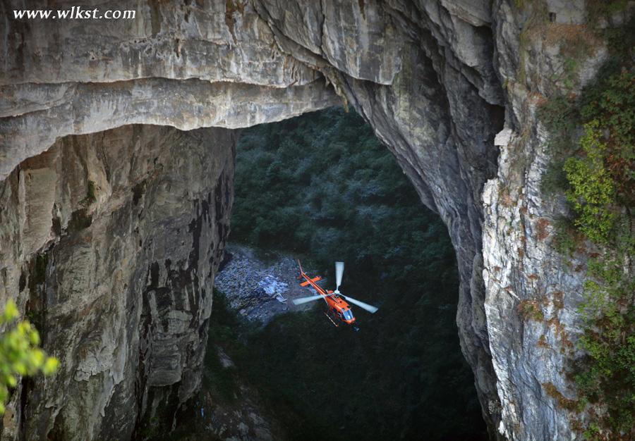 航拍拍摄了天生三硚的天龙天坑、神鹰天坑,此次航拍拍摄难度系数非常高,全速低空飞行穿越了天龙桥和青龙桥两个桥洞,螺旋桨距岩壁最近距离仅三米。