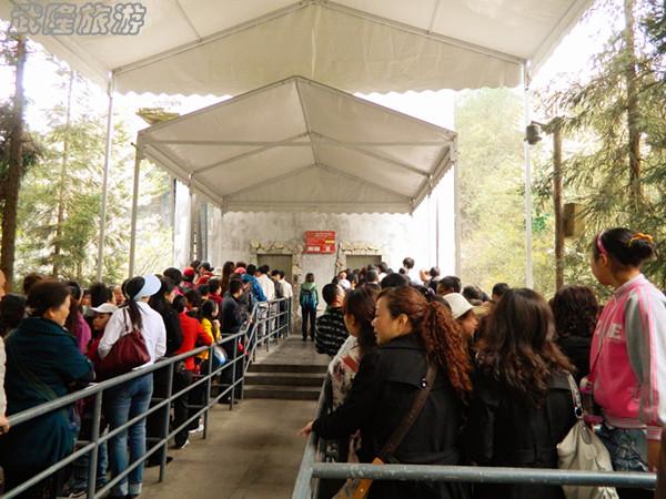 记者搭乘景区中转车,跟随游客到了天生三桥景区。由于游客很多,观光电梯运量有限,天生三桥景区增开了一个入口。