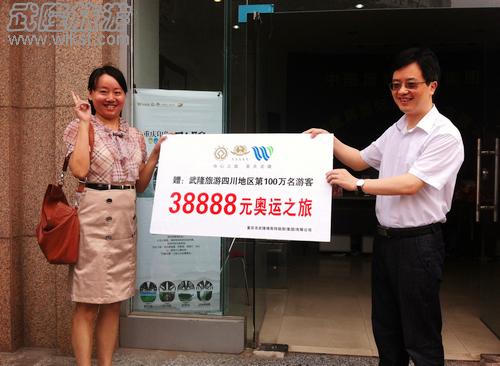 7月8日下午2点,据武隆景区数据统计,从2009年开始至今武隆澳网官方网站接待四川游客量突破100万人,这标志着四川已经成为武隆澳网官方网站核心的客源地。根据现场确认,这位第100万名幸运儿是一位来自成都的王女士,在第1000家形象店开业典礼现场,武隆景区将价值3万元的“伦敦奥运游”送给了王女士。