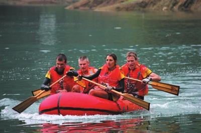9月的乌江碧波荡漾,虽是枯水季节,但江中布满了险滩和激流。在橡皮艇项目比赛中,运动员要从石桥湖大桥上速降至湖面,然后游泳上岸,爬上四人橡皮艇,划至1.2公里后最终到达三河口终点。期间外国队的队员们表现出了惊人的实力,而中国选手在这个项目中并没有被“考住”。