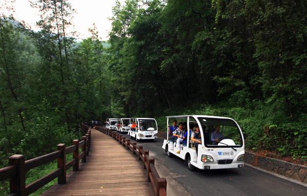 一辆辆载满游客的景区大巴车络绎不绝的驶进天生三桥停车场,大巴车不间歇的在天生三桥、龙水峡地缝、仙女镇游客接待中心之间运转。从车上下来,游客一队队跟着导游,或三五成群的向着检票口走去。