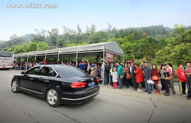 昨日天气由晴转阴,气温的降低,不仅没有降低游客的出游热情,反而增添了一丝期许,武隆的各大景区人气爆棚,但景区的接待却井然有序。游客依次排队乘车、检票,鱼贯而入,显得有条不紊。今年芙蓉洞仍延续去年的中转运输方式,芙蓉洞入口位于山腰,下临芙蓉江,入口处的停车场无法容纳众多的自驾车,所有的自驾车需停在江口镇的临时停车场,然后公司的大巴进行中转。