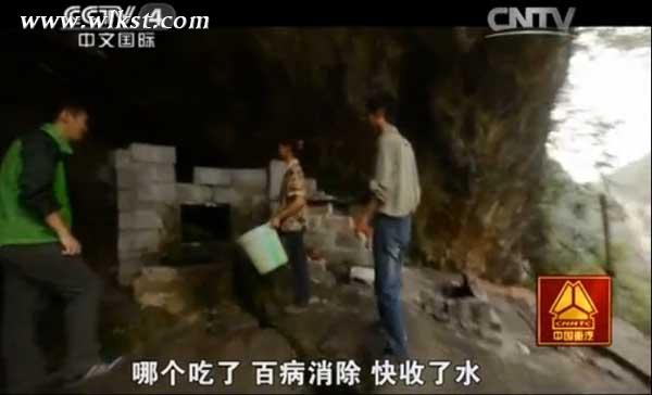 在和村民闲聊中,最吸引央视记者的是村民最引以为傲的三潮圣水,因每天只在固定时间间歇出三次水而得名,被当地人誉为“上天赐予的神水”。村里更流传着,只有运气好的人才会赶上圣水出水的说法。每到圣水出水时段,络绎不绝的村民便会聚集在出水口等候,接上一大桶带回家给老人和孩子,据说有包治百病、强生健体的功效。