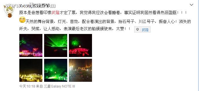 网友T-enny还没耍够:“原本是爸想看印像武隆才定了票,我觉得我应该会看睡着,事实证明我居然看得热泪盈眶!!!天然的舞台背景,灯光、音效,配合着演出的背景,抬石号子、川江号子,振奋人心!消失的纤夫,哭嫁,让人感动,表演最后老汉的船缓缓驶来,太赞!!”