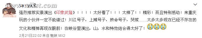 网友Laviya优:“强烈推荐实景演出《印象武隆》!!!!太好看了!!!太棒了!!精彩!而且特别感动!来重庆玩的小伙伴一定不能错过!川江号子,上摊号子,拼命号子,哭嫁……太多太多现在已经不存在的文化和精神再现在眼前!在峡谷里演出,山,水和特效结合得太好了!”