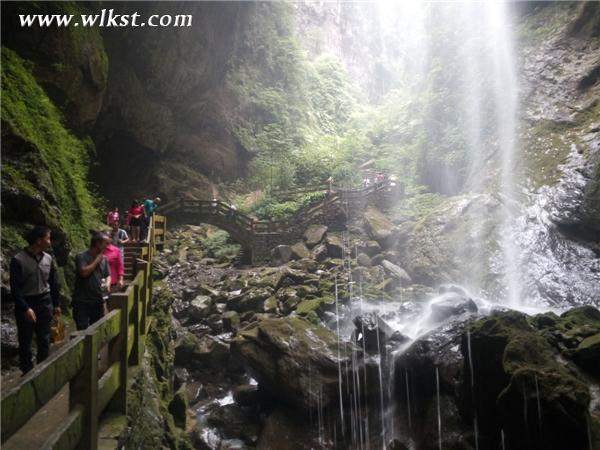 游客在龙水峡地缝景区——珠帘瀑布景点游览
