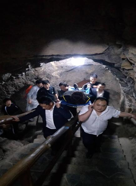 地缝景区在接到游客求助信息后,景区立即启动应急救援预案,组织应急救援小队对游客展开救助。5分钟后景区救援人员赶到现场,查看游客病情后,迅速决定用担架的方式将游客抬出景区。在长达800米爬坡上坎的景区游道路途中,救援人员轮换着用肩扛、手抬等方式用时10分钟时间,迅速将游客抬到景区进口。大约休息10分钟左右,游客感觉病情有所好转。并在上车前,谭平的妹妹从包里拿出一叠钞票饱含着泪水说道:“给大家买点水喝,辛苦大家了”,救援人员再三推辞,坚决不收。