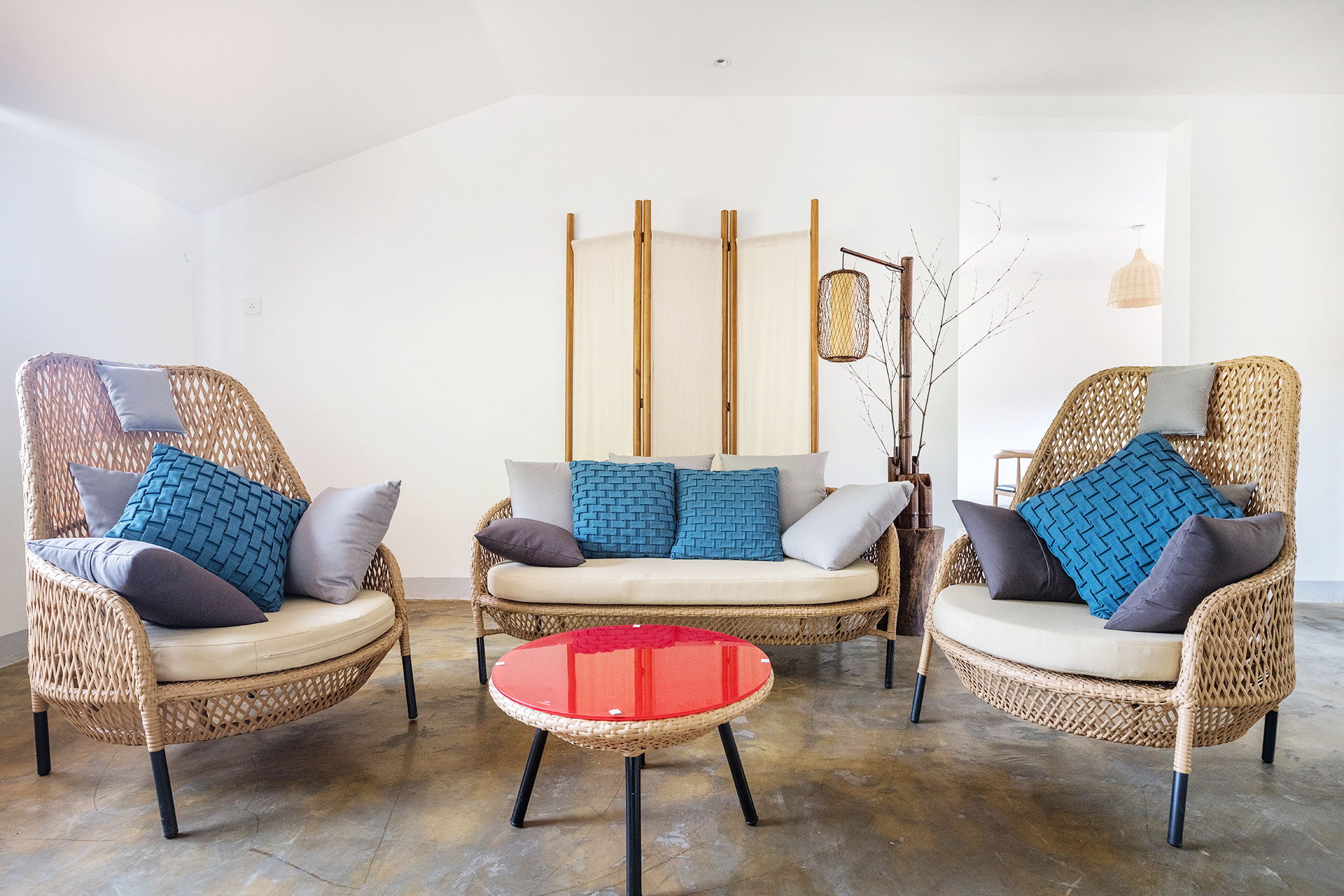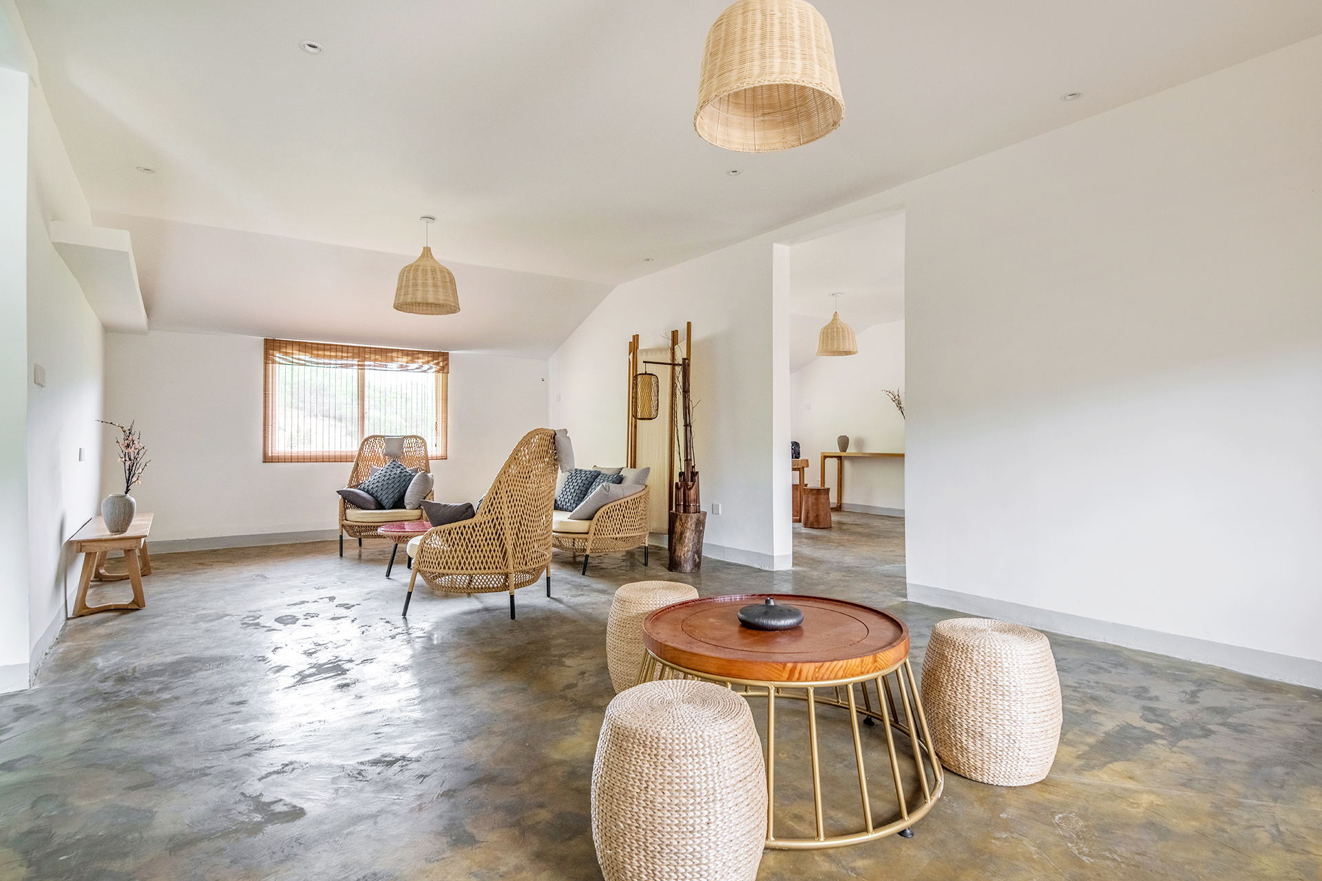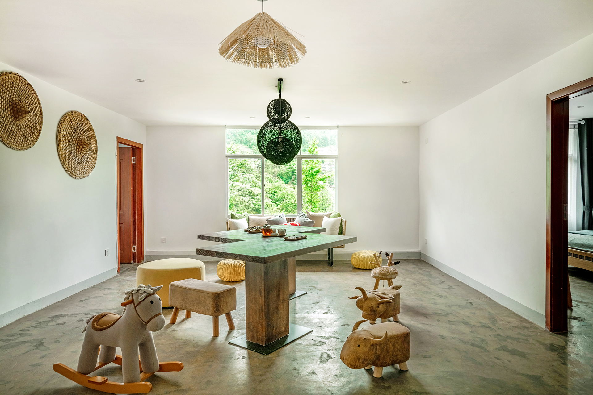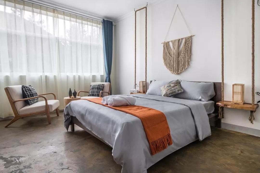 客厅的香樟木凳散发出自然淡雅的幽香;竹制落地灯和藤编沙发完美诠释出素雅的视觉感触;木雕花瓶和秋千似的床头柜隐隐显露出文艺效果。