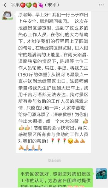 安全返回上海家中之后,6月25日,宋平再次通过微信向涂金川发来感谢,她表示,正是有了景区工作人员的热心帮助,他们的旅行才能划上圆满的句号。接下来,他们还将撰写感谢信,表达对所有参与救助人员的感激之情。