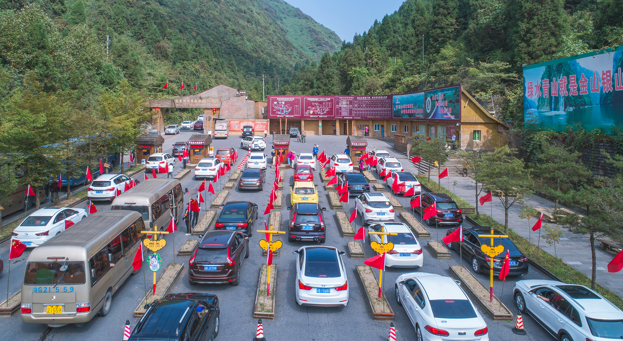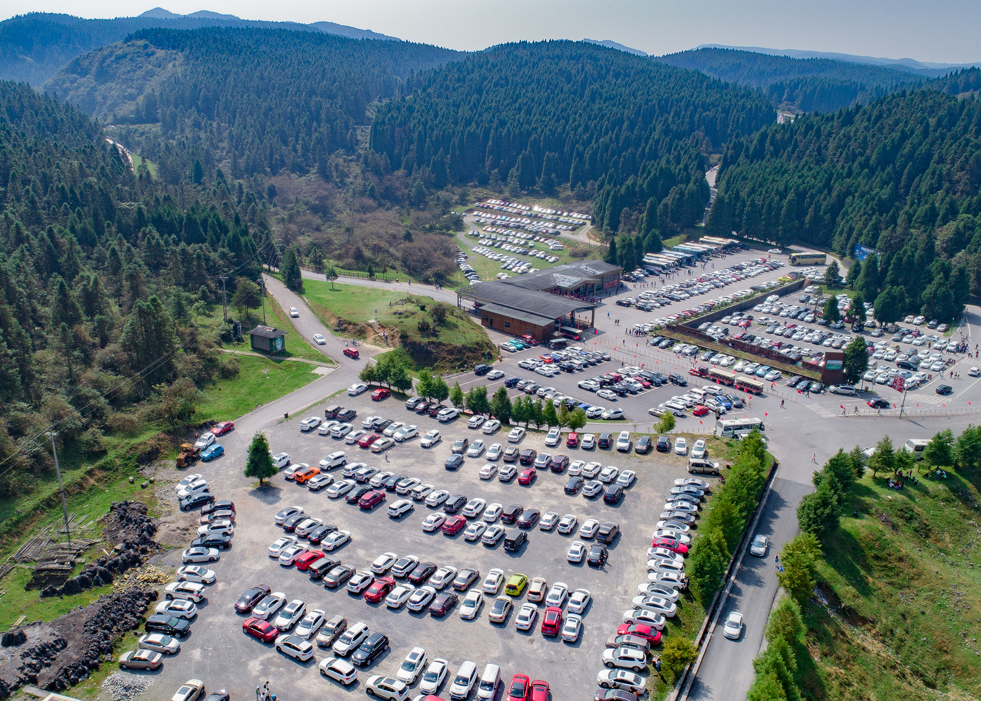 航拍仙女山游客接待中心,自驾车辆停放、行进有序。