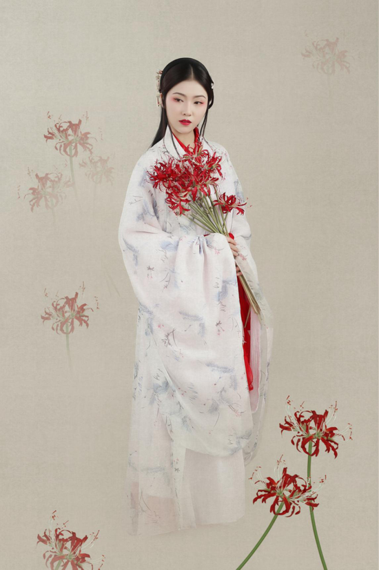 这套服饰灵感来源于灵魂摆渡神话作品故事,色调用飘逸仙气的仙鹤白色底纹,和鲜红的彼岸花形成对比,骆虹宇演绎出缥缈仙气之感。袖口里的红色,作为点睛之笔使人物主题更加素净,如图唯美古典的画中人。