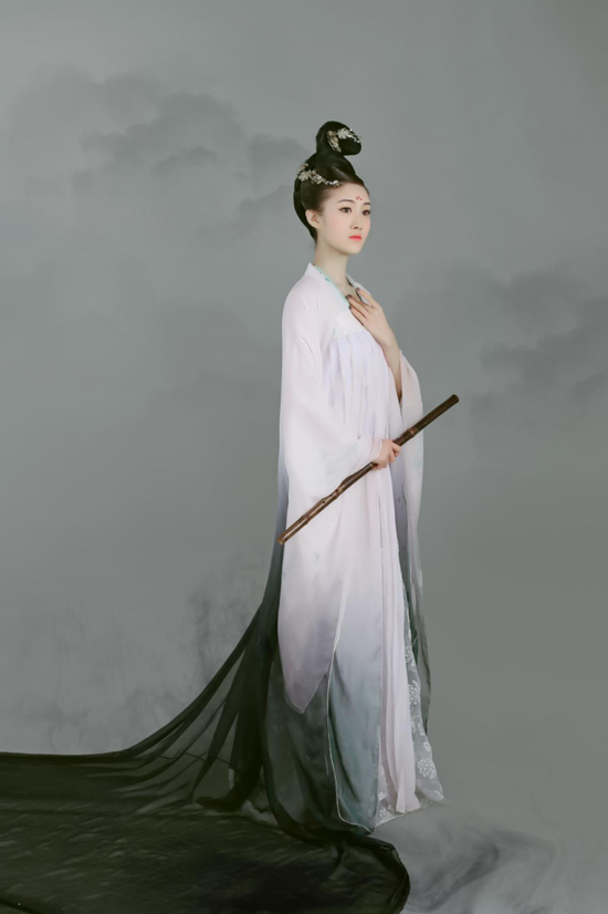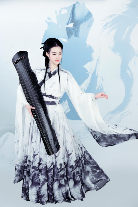 一位衣裳飘飘的唐代女子,在水墨丹青的山水画里化身为磨,在天地间自由舞动。刘希贝的造型以水墨、书法形式来展现女子在画中自由舞动的意境,造型圣洁,身姿摇曳,采用了素净的背景,实现人物的整体立体感,线条美感。